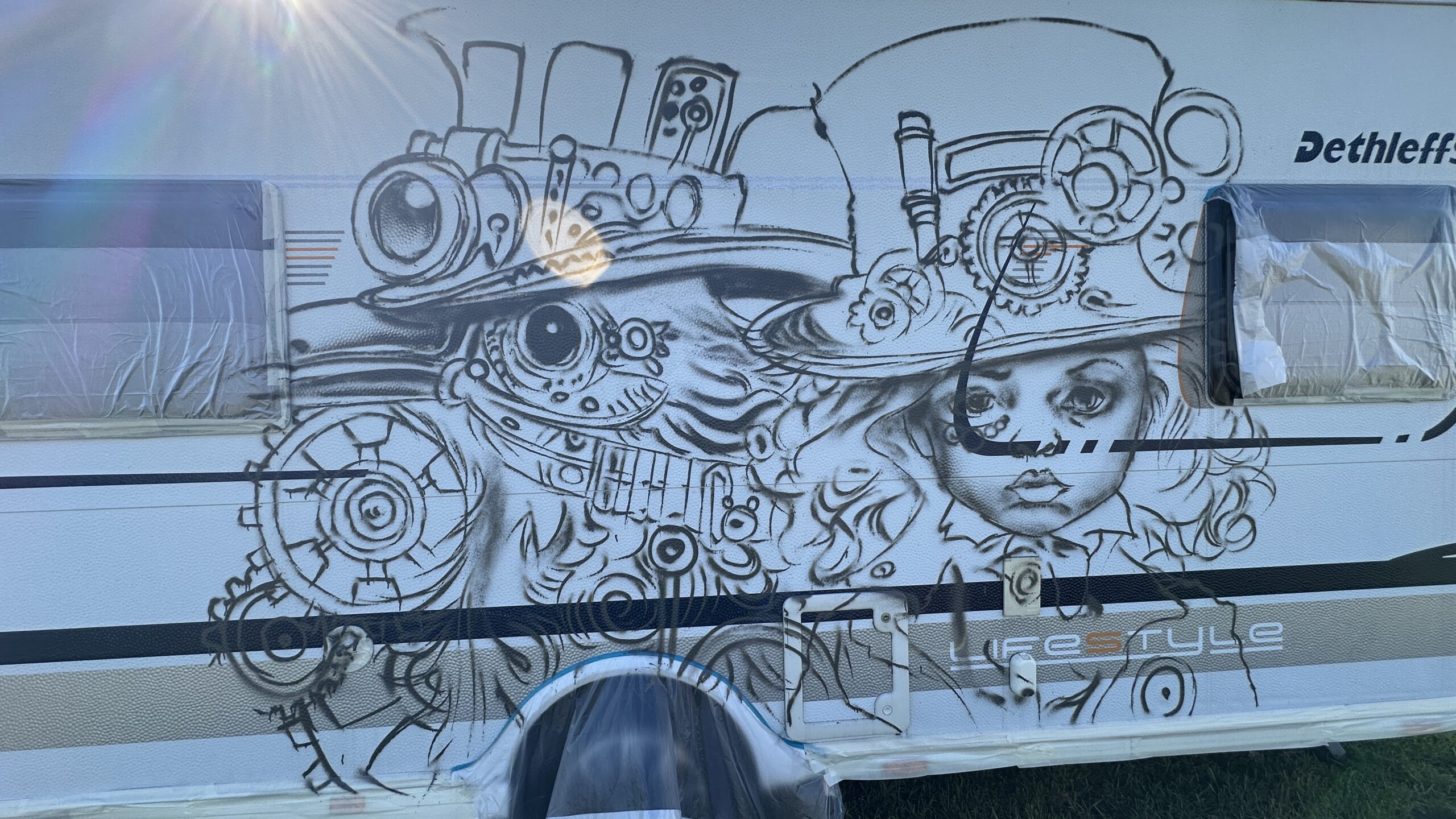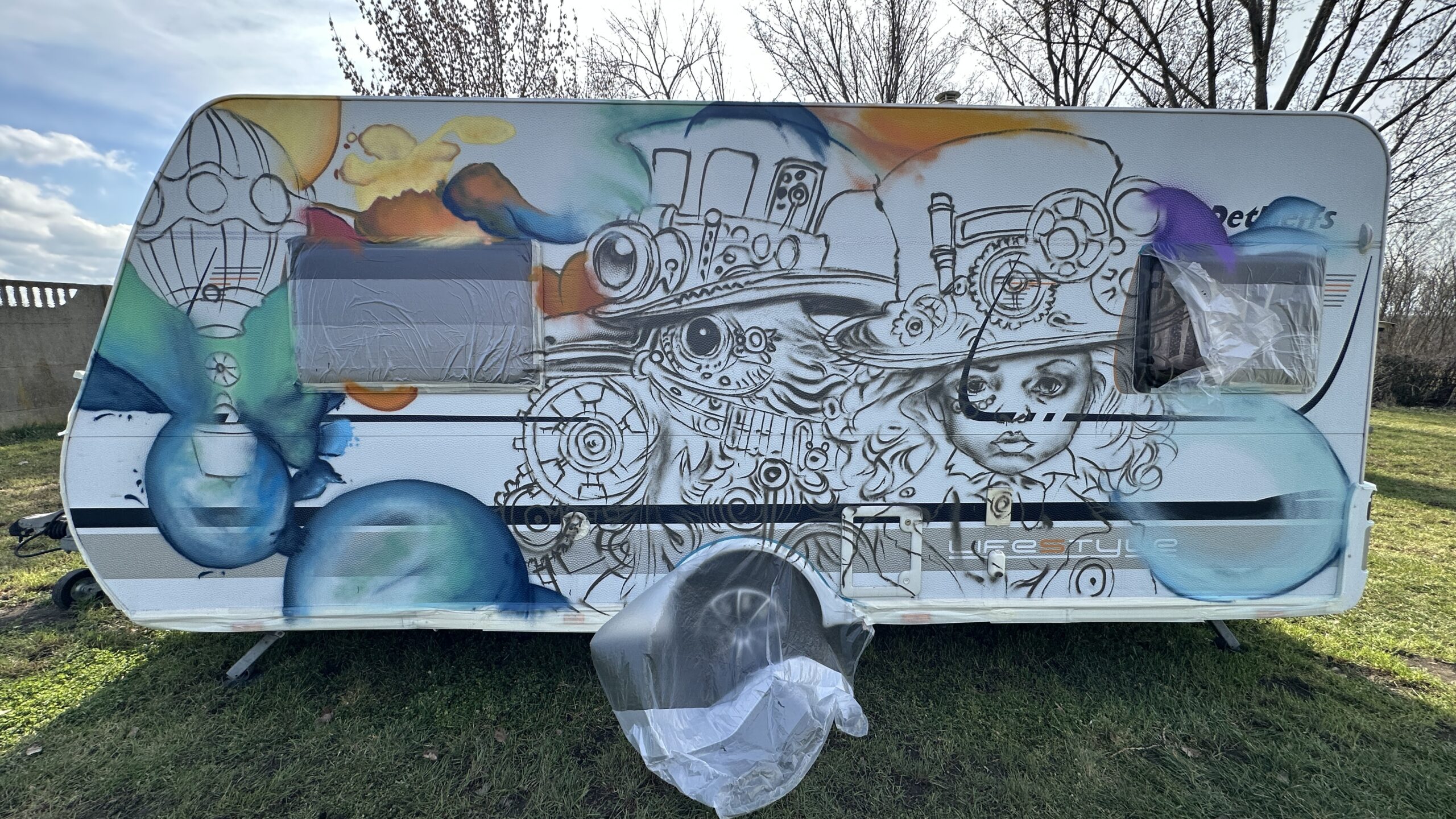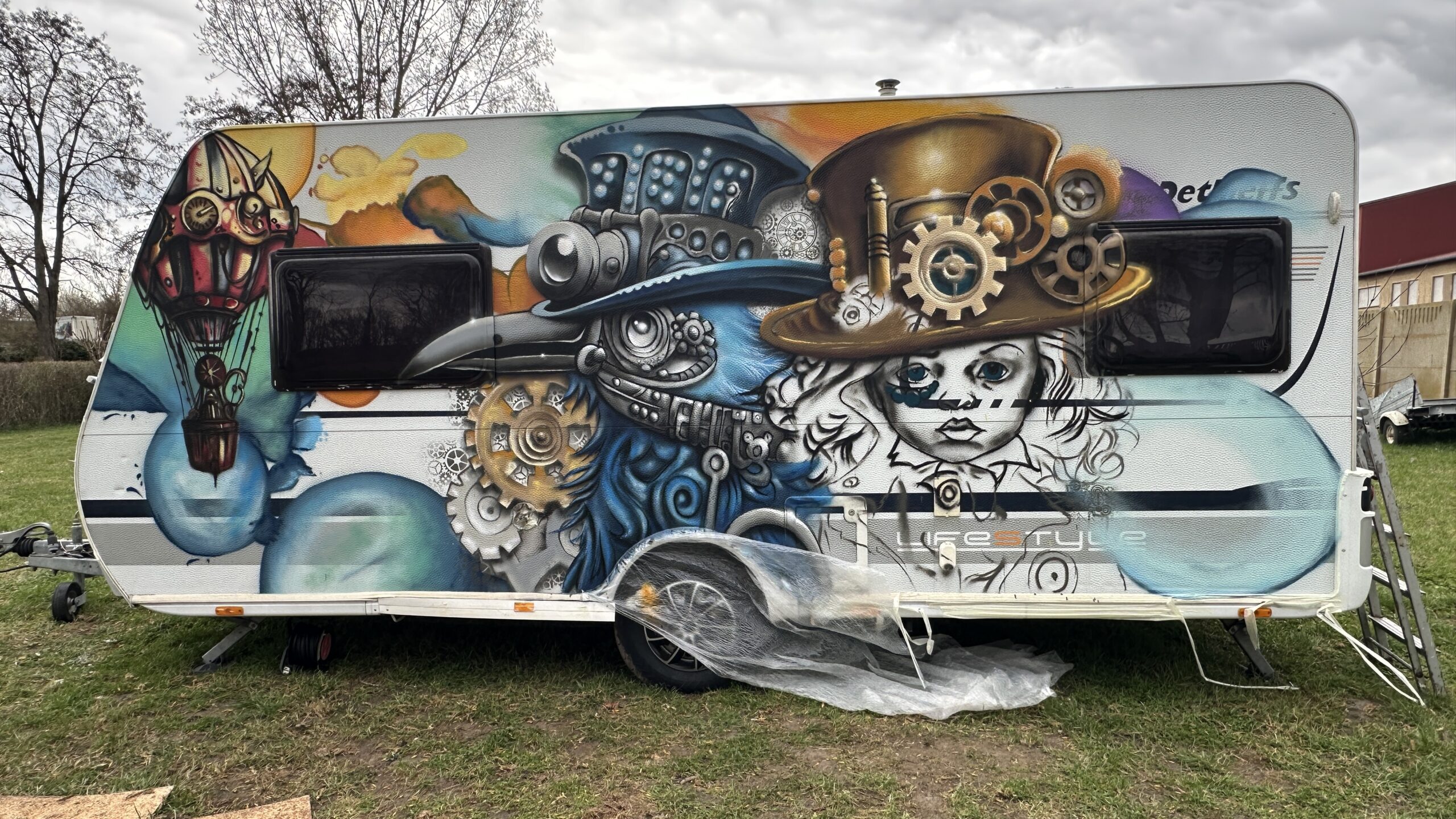 2026 wurde ich gefragt, ob ich einen Wohnwagen gestalten könne, der mich thematisch in eine ganz neue Welt entführte. Steam-Punk, eine Mischung aus Stilen des 19. Jh. und futuristischen Elementen. Die Kleinteiligkeit war eine Herausforderung, die aber doch sehr viel Spass bereitete. Aus der Zusammenarbeit mit Max Robra entstand dann das Gesamtergebnis.