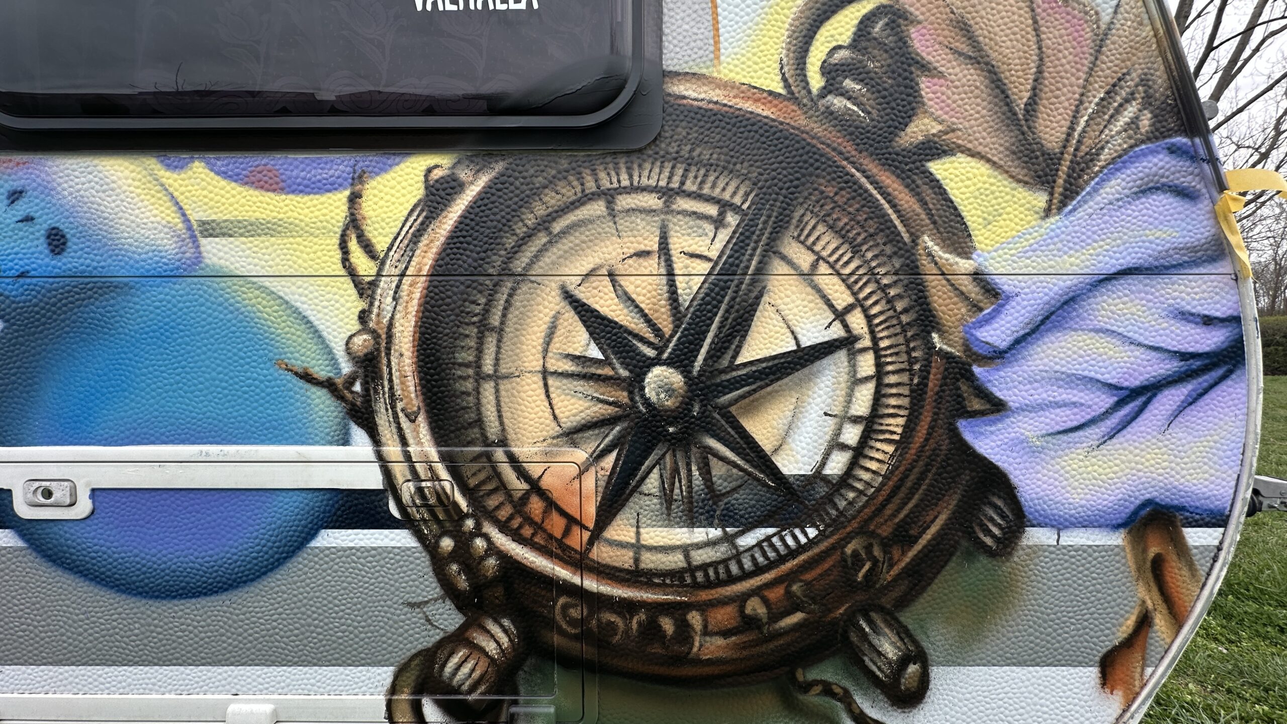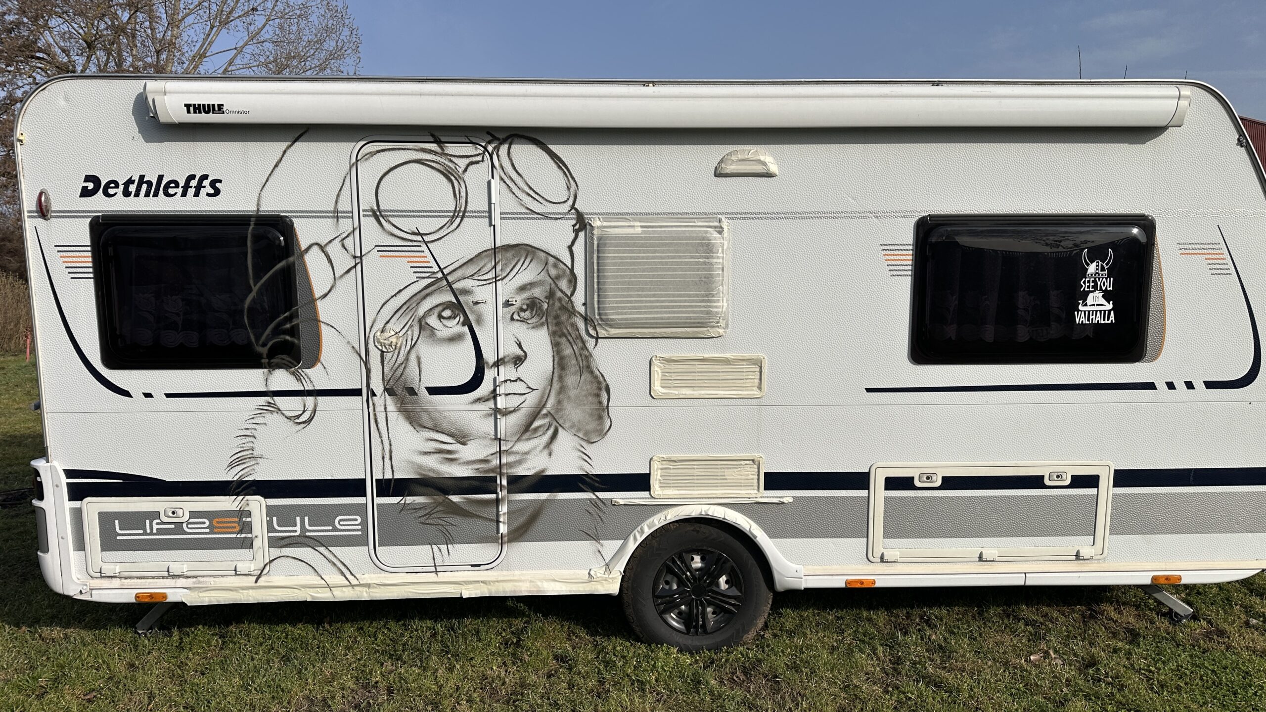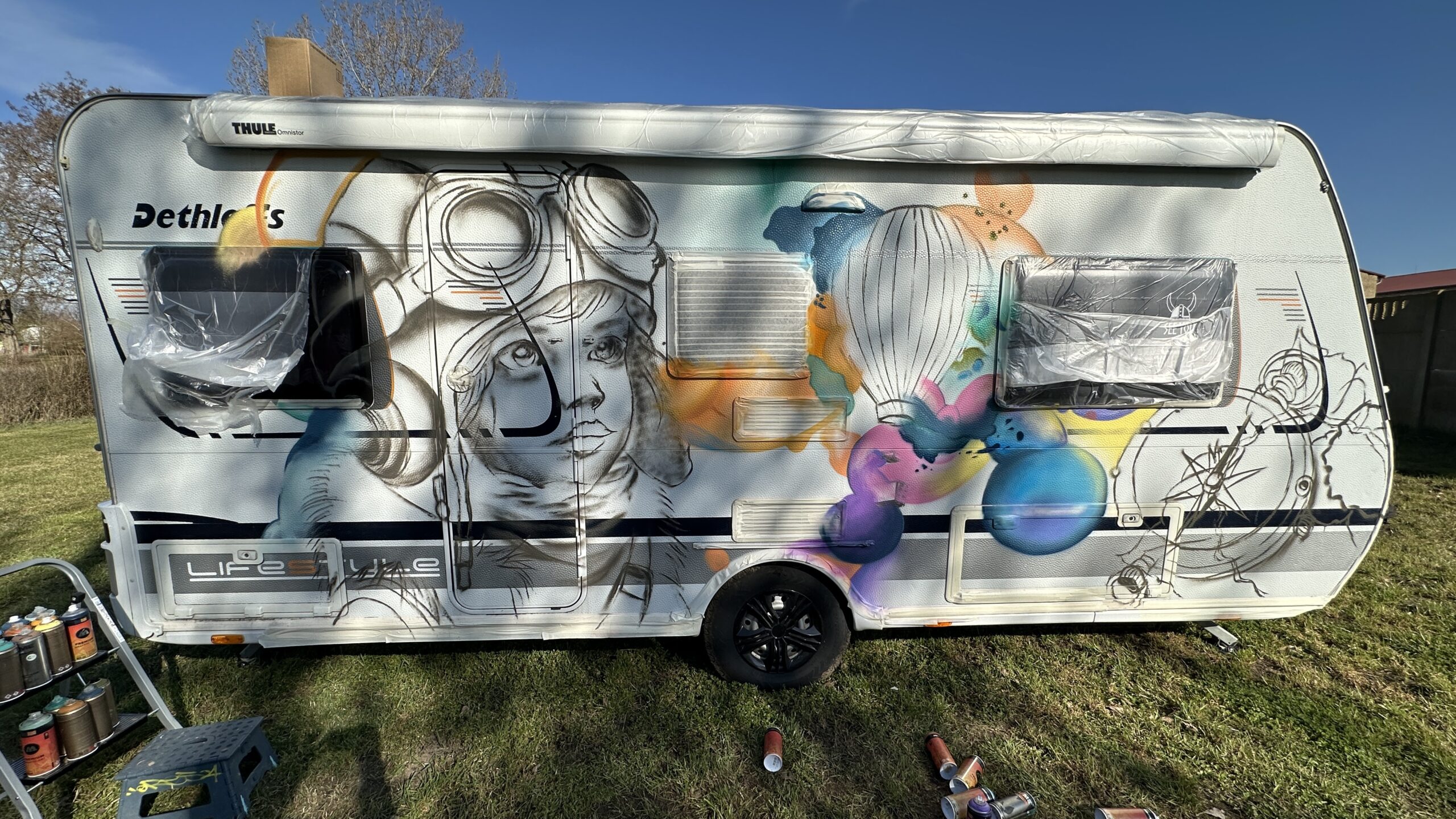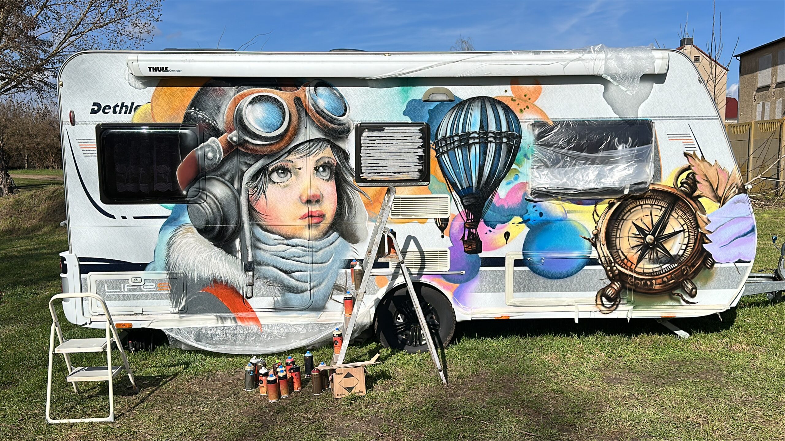 2026 wurde ich gefragt, ob ich einen Wohnwagen gestalten könne, der mich thematisch in eine ganz neue Welt entführte. Steam-Punk, eine Mischung aus Stilen des 19. Jh. und futuristischen Elementen. Die Kleinteiligkeit war eine Herausforderung, die aber doch sehr viel Spass bereitete. Aus der Zusammenarbeit mit Max Robra entstand dann das Gesamtergebnis.